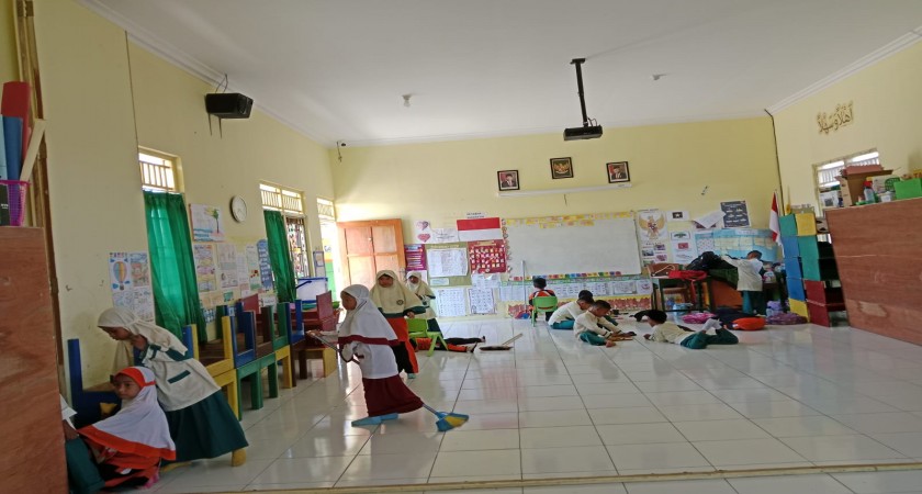 Usai bersih-bersih, anak-anak bercengkrama dengan teman-temannya. Setelah sekian lama berpisah selama liburan, kini mereka bertemu kembali di sekolah. Tampak sekali mereka bermain bersama, sama-sama melepas rindu.